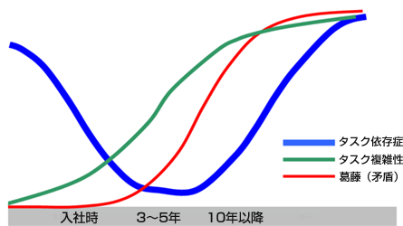 葛藤(矛盾)が発生するのは、後輩ができた時や関連部署など他との関係が発生するといったような関わりが広くなると葛藤は大きくなり、課題の困難性とも比例していきます。