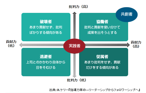 5SHIPの一つであるフォローワーシップを発揮するには、右図のように批判力と貢献力により、協働者としての役割を果たす必要があります。