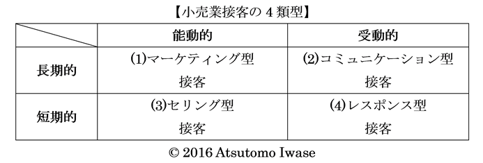 この2軸を掛け合わせ、マトリックスにすると、接客を4つの類型に整理することができます。
